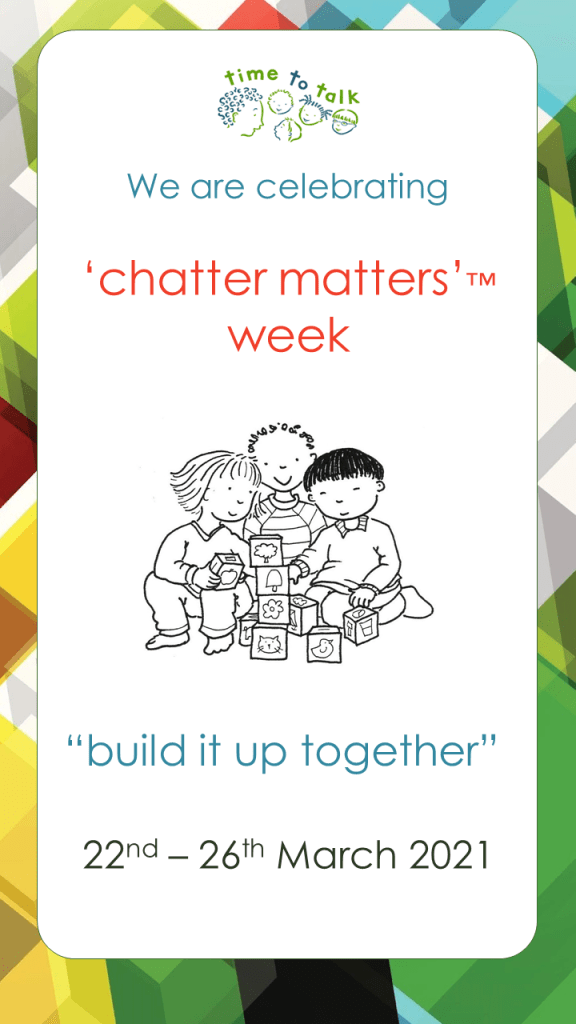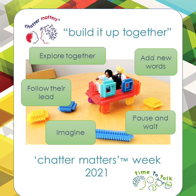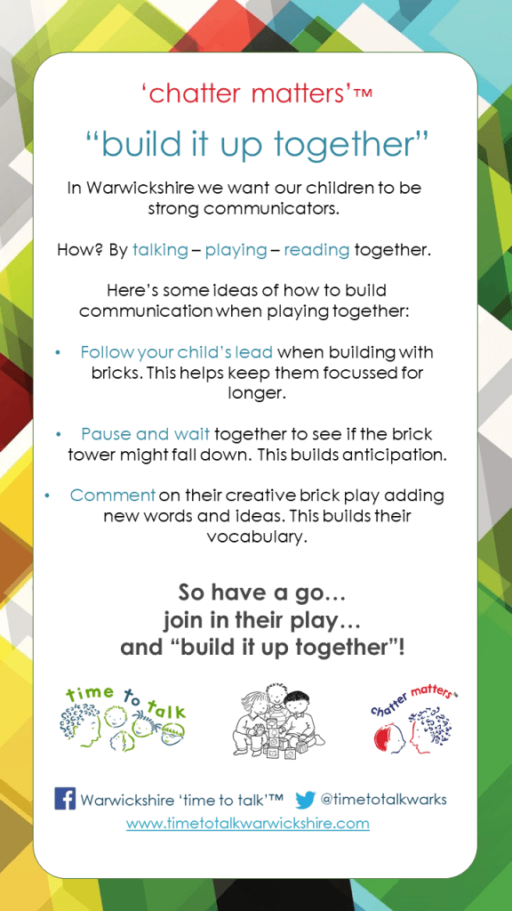 We will be celebrating children’s communication in Warwickshire this year during our annual ‘chatter matters’ week. We want to build strong foundations for communication. The theme: “chatter matters – build it up together” aims to give you opportunities to share our strategies with families, using the topic of constructive play. Whether it is supporting children to attend for a little longer, build anticipation to the tower that might fall down, or develop turn-taking and negotiation skills as the children design a brick castle – we can support children’s communication when accessing construction play.