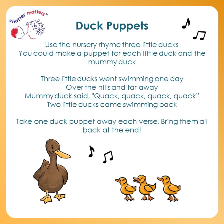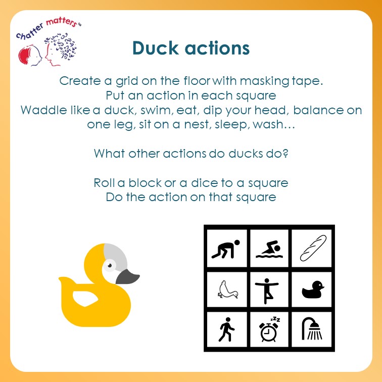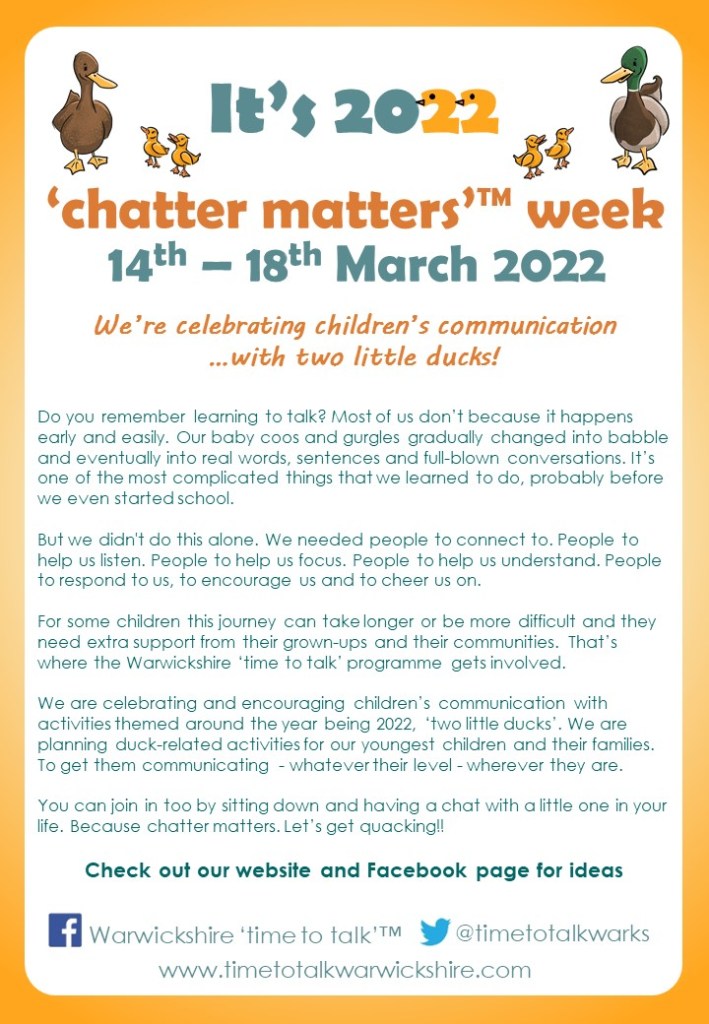 We are celebrating children’s communication with two little ducks (a link to the year 2022). Here are some resources that you can use to help share messages around the value of communication themed around ducks! First, a poster to print…