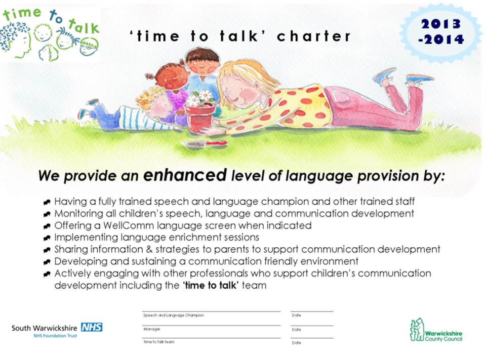 The ‘time to talk’ enhanced award is a certificate of achievement and commitment to implement the ‘time to talk’ strategy in a Children and Family Centre or Early Years SettingRecognition of the Speech and Language Champion and their team for all the learning, implementing and sustaining of the ‘time to talk’ strategy.Settings receive a certificate to display – as a charter outlining the key elements of the strategy.Champions must fulfill and provide documentary evidence of all areas of the ‘time to talk’ strategy.Most of the portfolio is work that you already do to support children’s communication.The supporting document provides the full details. The Speech and Language Champions must be trained to Tier 3, and other staff with key responsibilities must be trained to Tier 1.Yes you do. You might use the Communication Monitoring Document for this.Attending ‘time to talk’ cluster meetings is a great way to pick up new ideas for sharing information with parents.Here are some examples.Developing and sustaining a communication friendly environment is an ongoing process. ‘time to talk’ can signpost you towards resources that can support this process. It begins with an audit… but it never really ends!!Some examples of how to start developing a communication friendly environment.How long is a piece of string?! There is no set length.How will it help us with Ofsted?A quote from a setting that have implemented the ‘time to talk’ strategy.Source: https://www.gov.uk/government/publications/conducting-early-years-inspectionsKnowledge of ages and stages is covered throughout training and reference materials are provided.The Communication Monitoring Document can be used as a baseline measure.Champions learn how to identify need based on a red, amber, green system.Champions learn how to implement language enrichment in their Children’s Centre or EY Setting.‘time to talk’ support Champions to track children’s speech, language and communication development.